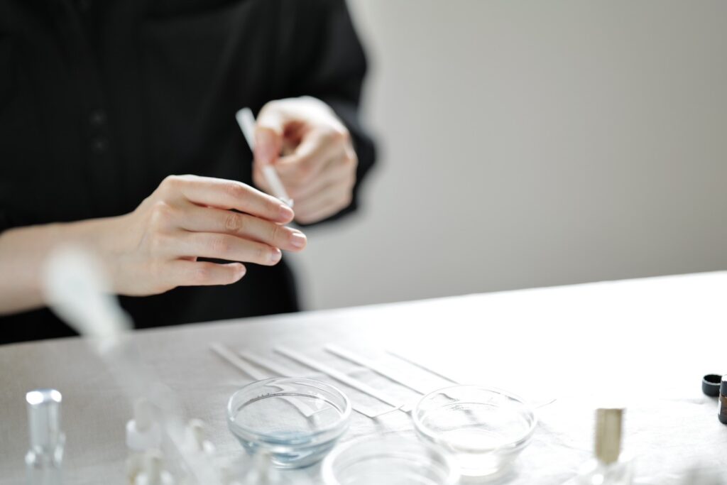 アロマ調香スタイリスト講座は、アロマ調香の基礎からパーソナルブレンドの提案までを学ぶ実践形式の中級講座。